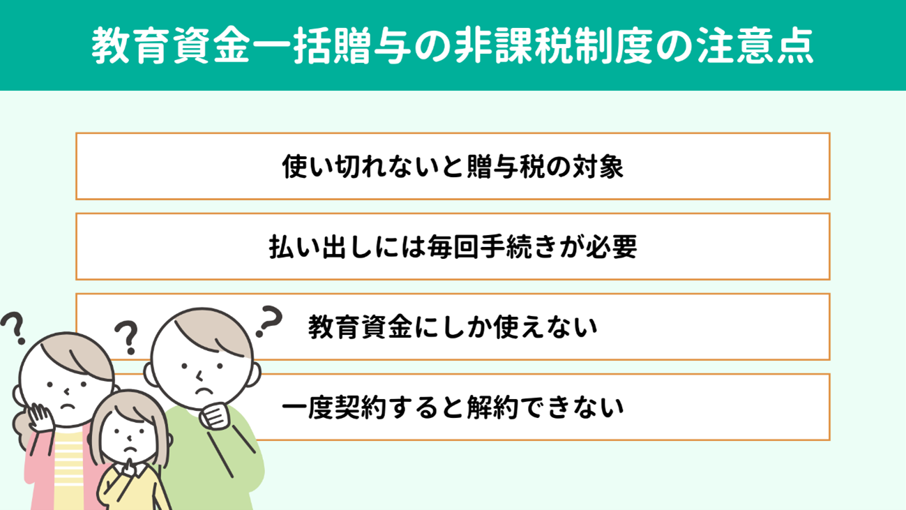 ですから、相続税対策として本制度を利用するメリットがある人でも、教育費の見通しや手続きの手間を天秤にかけて、利用するか否か慎重に判断する必要があります。